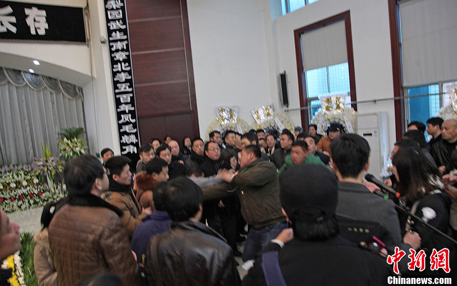 2月16日上午,六小龄童之父六龄童章宗义追悼会举行,众多人赶往现场参加悼念。追悼会开始前,因家庭纠纷,数名亲属大打出手,一男子面部被打伤,几个花圈被推倒。在众人的劝说下,事态终于平息。王志成 摄